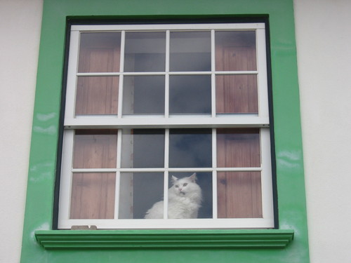 Aquele canto, num rés do chão, onde um enorme gato pardo dorme encostado ao vidro aquecido pela manhã solarenga. E quando não está o felino, surge uma idosa. Provavelmente ambos procuram na rua o interesse que não encontram em casa.